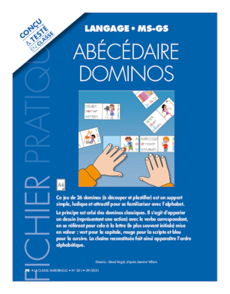Ce jeu de 26 dominos (à découper et plastifier) est un support simple, ludique et attractif pour se familiariser avec l'alphabet. Le principe est celui des dominos classiques. Il s'agit d'apparier un dessin (représentant une action) avec le verbe correspondant, en se référant pour cela à la lettre (le plus souvent initiale) mise en valeur : vert pour la capitale, rouge pour la scripte et bleu pour la cursive. La chaîne reconstituée fait ainsi apparaître l'ordre alphabétique.