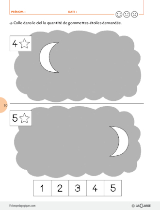 Constituer une collection d'après une quantité donnée. Lire les nombres jusqu'à 5. Reconnaître ces formes : rond, carré, triangle. Identifier 2 formes : rond, étoile. Poursuivre des algorithmes simples.