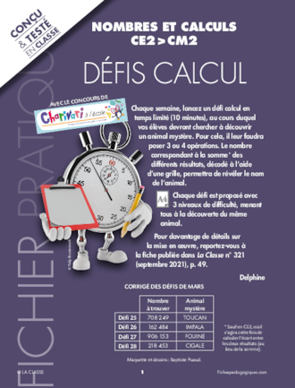 Chaque semaine, lancez un défi calcul en temps limité (10 minutes), au cours duquel vos élèves devront chercher à découvrir un animal mystère. Pour cela, il leur faudra poser 3 ou 4 opérations. Le nombre correspondant à la somme (sauf en CE2, où il s'agira cette fois de calculer l'écart entre les deux résultats). des différents résultats, décodé à l'aide d'une grille, permettra de révéler le nom de l'animal.