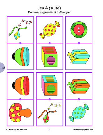 Chaque jeu (24 pièces à agrandir, découper et plastifier) se joue comme une partie de dominos classique.