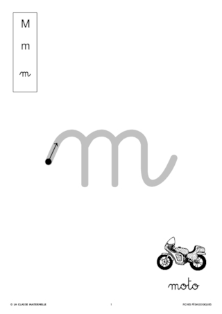 Ce fichier offre la possibilité aux élèves de GS voire de CP d'apprendre à tracer en cursive la lettre M. Pour cela plusieurs exercices d'entraînement sont proposés : dans un premier temps repasser sur la lettre en gris avec points de départ du tracé et sens indiqués. Deuxième série où la lettre doit être écrite sans ligne d'appui puis sur des réglures type double ligne. Enfin dans la dernière partie, la lettre ainsi que deux mots proposés sont à écrire sur des lignages type Séyès.