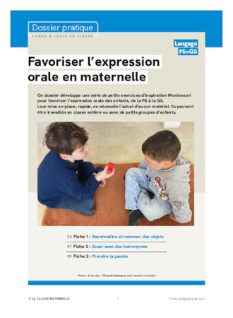 Ce dossier développe une série de petits exercices d'inspiration Montessori pour favoriser l'expression orale des enfants, de la PS à la GS. Leur mise en place, rapide, ne nécessite l'achat d'aucun matériel. Ils peuvent être travaillés en classe entière ou avec de petits groupes d'enfants.