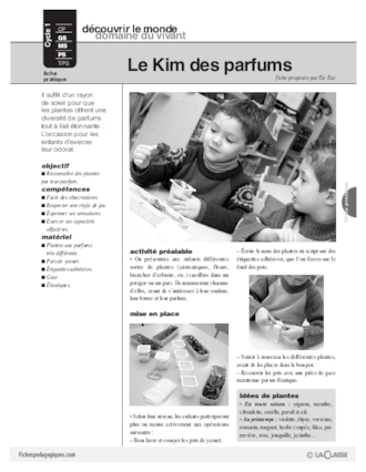 Le Kim des parfums Ajouter aux favoris PS MS GS Ressource de sciences et technologie pour les niveaux PS, MS et GS Description Il suffit d'un rayon de soleil pour que les plantes offrent une diversité de parfums tout à fait étonnante... L'occasion pour les enfants d'exercer leur odorat. Compétences Reconnaître des plantes par leur parfum. Mots-clés sciences expérience expérimentation parfum plante jeu de Kim Télécharger Ressources 2 pages / 1 crédit Partagez cette fiche