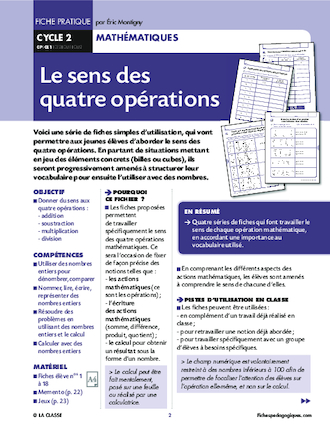 Les Instructions ministérielles de 2018 préconisent d’aborder, dès le CP, « l’étude des quatre opérations (addition, soustraction, multiplication, division) […] à partir de problèmes qui contribuent à leur donner du sens ». Tel est l’objet de ce fichier, qui veille également à l’emploi d’un vocabulaire mathématique précis. À cet effet, un petit memento à l’usage des élèves est proposé à la fin.
