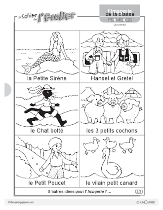 18 images pour exploiter le thème des contes traditionnels, notamment par le biais de personnages phares: Blanche-Neige, Cendrillon, la Belle au bois dormant, Peau d'âne, Boucle d'or, le Petit Chaperon rouge, la Petite Sirène, Hansel et Gretel, le Chat botté, les 3 petits cochons, le Petit Poucet...
