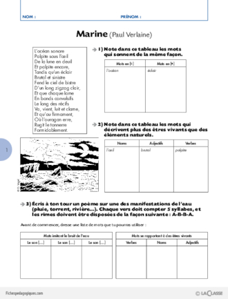 Après une discussion destinée à nommer les différents éléments naturels, on mettra en place un travail littéraire destiné à décrire les états de l'eau. Un poème de Verlaine donnera des pistes de travail, notamment dans la recherche de figures de style qui s'apparentent à la personnification.