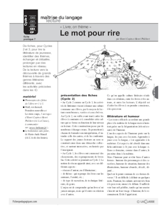 Dix fiches pour les 2 cycles, pour lire des textes de littérature jeunesse, identifier des thèmes, échanger et débattre, aller plus loin grâce à des propositions de lecture en réseau. Une démarche qui va vers la découverte de quelques grands thèmes de la littérature de jeunesse, dont les mots et l'humour dans cette fiche.