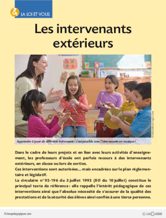 Dans le cadre de leurs projets et en lien avec leurs activités d'enseignement, les professeurs d'école ont parfois recours à des intervenants extérieurs, en classe ou lors de sorties. Ces interventions sont encadrées sur le plan réglementaire.