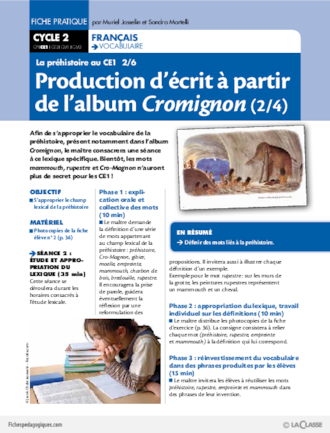 Pack thématique - Préhistoire au CE1 Ajouter aux favoris CE1 Ressource pour le niveau CE1 Description L'album « Cromignon », qui transporte les enfants au temps de la préhistoire, constitue un support idéal pour travailler le lexique, la narration et l'écriture. Mots-clés Préhistoire Cro-Magnon lecture écriture Lascaux peinture Télécharger Ressources 18 pages / 9 crédits Partagez cette fiche