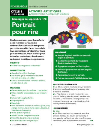 Connaître le schéma du visage. Maîtriser le geste : modeler et assembler des formes en pâte à modeler. Exercer la motricité fine : enfoncer les brins de laine dans la pâte.