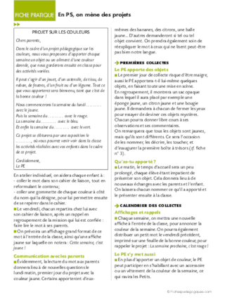 Ressource de pratiques artistiques et sciences et technologie et organisation pour le niveau PS dans les matières projet de classe et couleurs dans les sujets gestion des élèves, matériaux, objets, relation avec les parents et pratiques artistiques