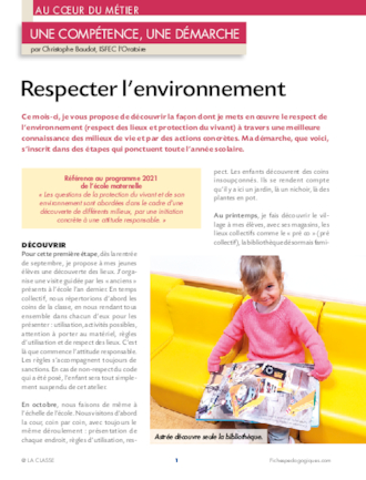 Les questions de la protection du vivant et de son environnement sont abordées dans le programme 2021 de l'école maternelle. Ce mois-ci, Christophe Beaudot vous propose de découvrir la façon dont il met en œuvre le respect de l'environnement (respect des lieux et protection du vivant) à travers une meilleure connaissance des milieux de vie et par des actions concrètes. Sa démarche, présentée dans cette fiche, s'inscrit dans des étapes qui ponctuent toute l'année scolaire.
